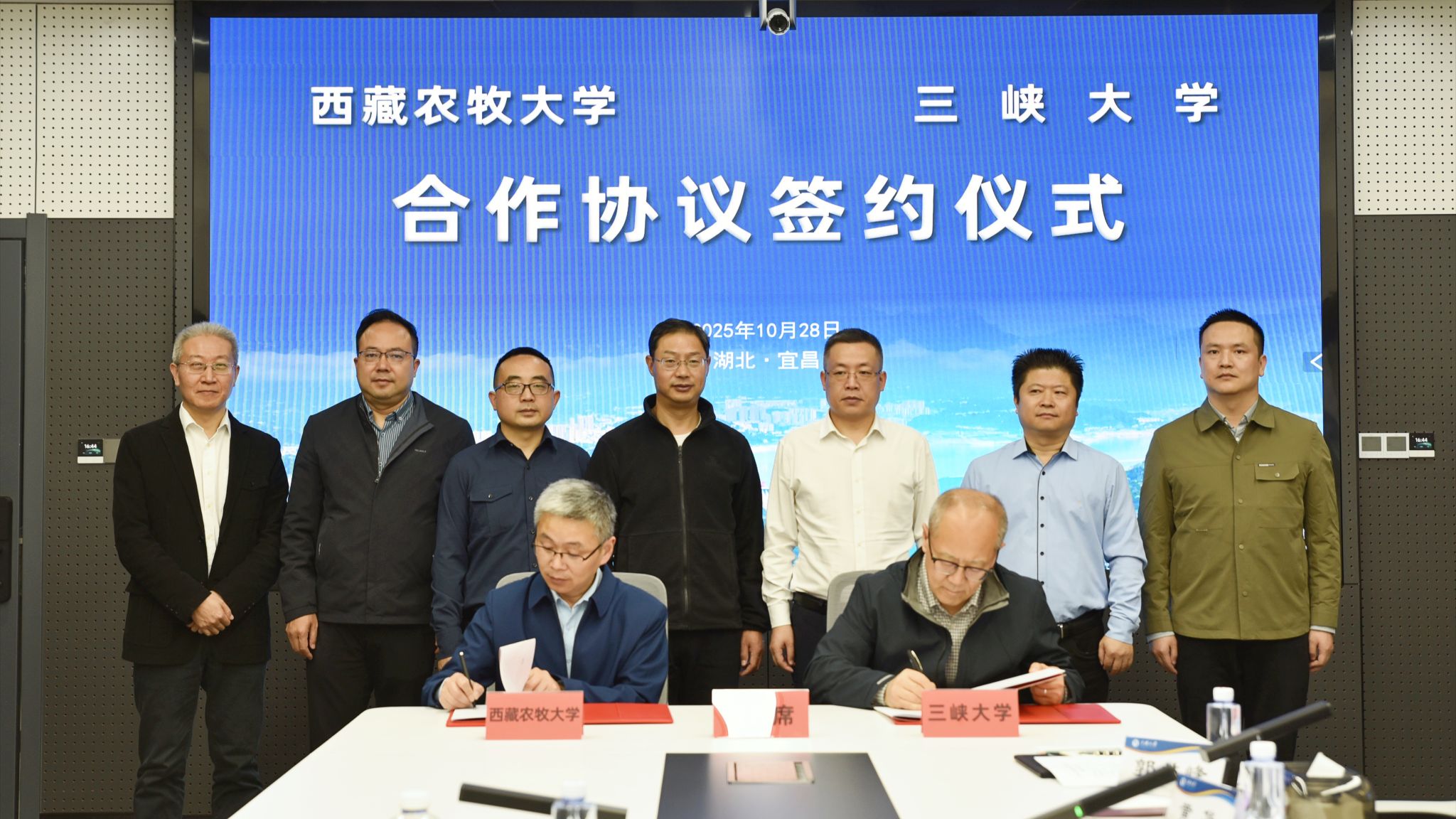 本网讯(通讯员 陈云龙/文 李昌旭/图)10月28日,三峡大学与西藏农牧大学在宜昌举行合作协议签约仪式,标志着两校围绕服务重大水电工程、推动区域创新发展迈出坚实一步,开启合作共赢、携手奋进的新篇章。西藏农牧大学党委委员、副校长邢震,三峡大学党委常委、副校长李东升,党委常委谈云志出席仪式。仪式由谈云志主持。